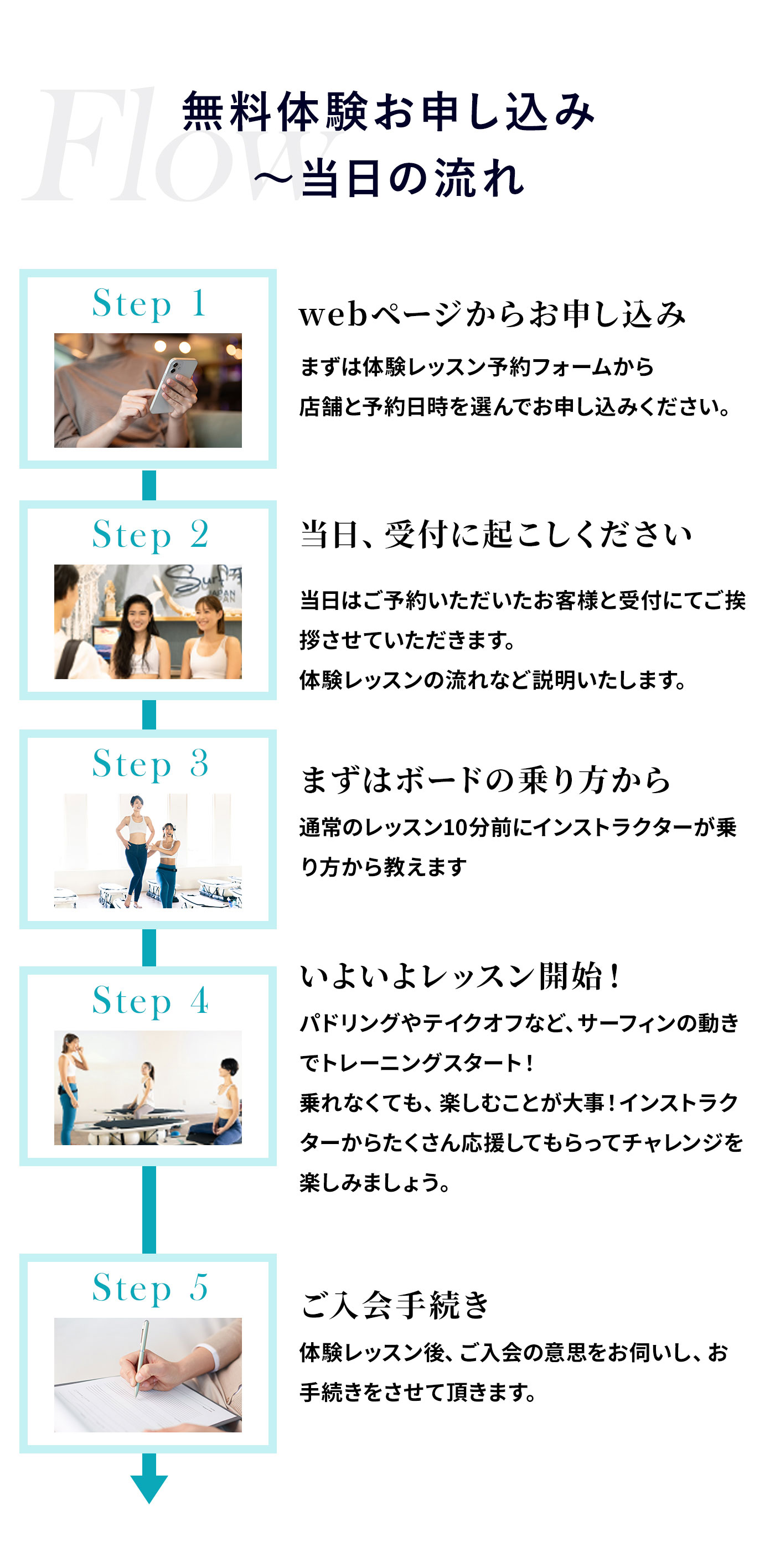 レッスン開始30分前にご来店いただき、体調チェックの簡単な用紙の記入、館内説明がございます。レッスン終了後は、シャワー、お着替え、レッスンのご案内なども含めてお帰りまで約2時間程度 お時間を見ていただいております。